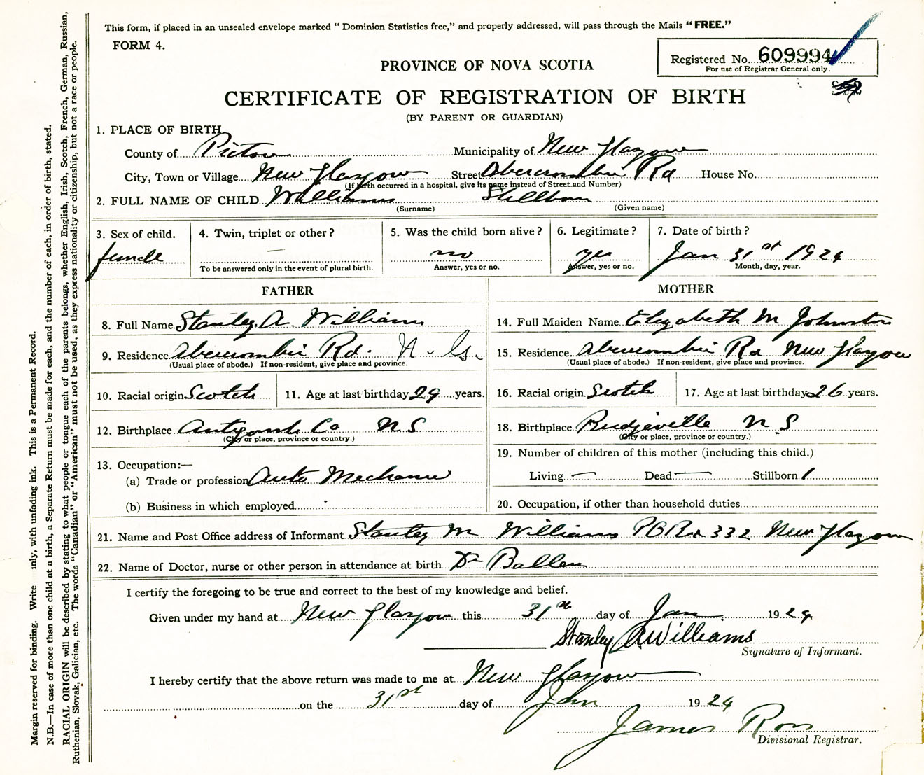 Female Birth Registration: Year: 1924 number: 60900994