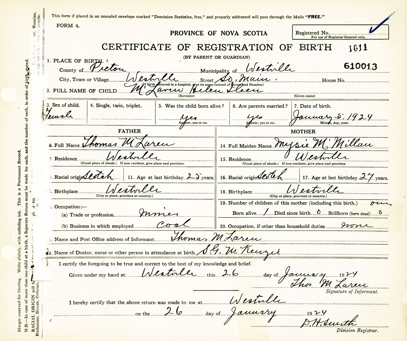 Female Birth Registration: Year: 1924 number: 61000013