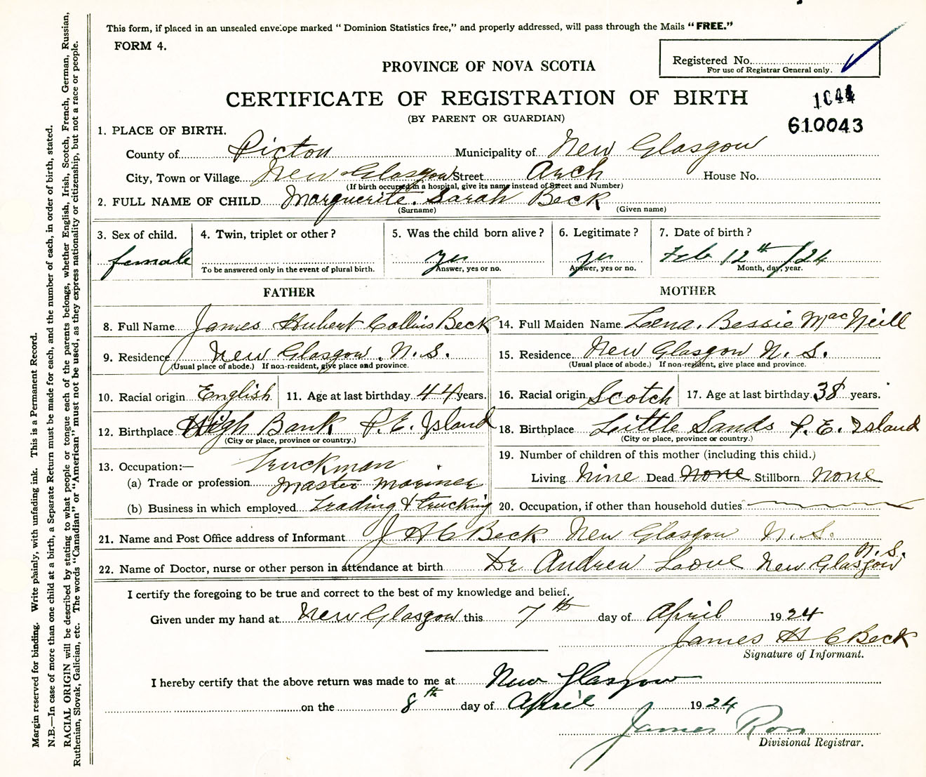 Female Birth Registration: Year: 1924 number: 61000043