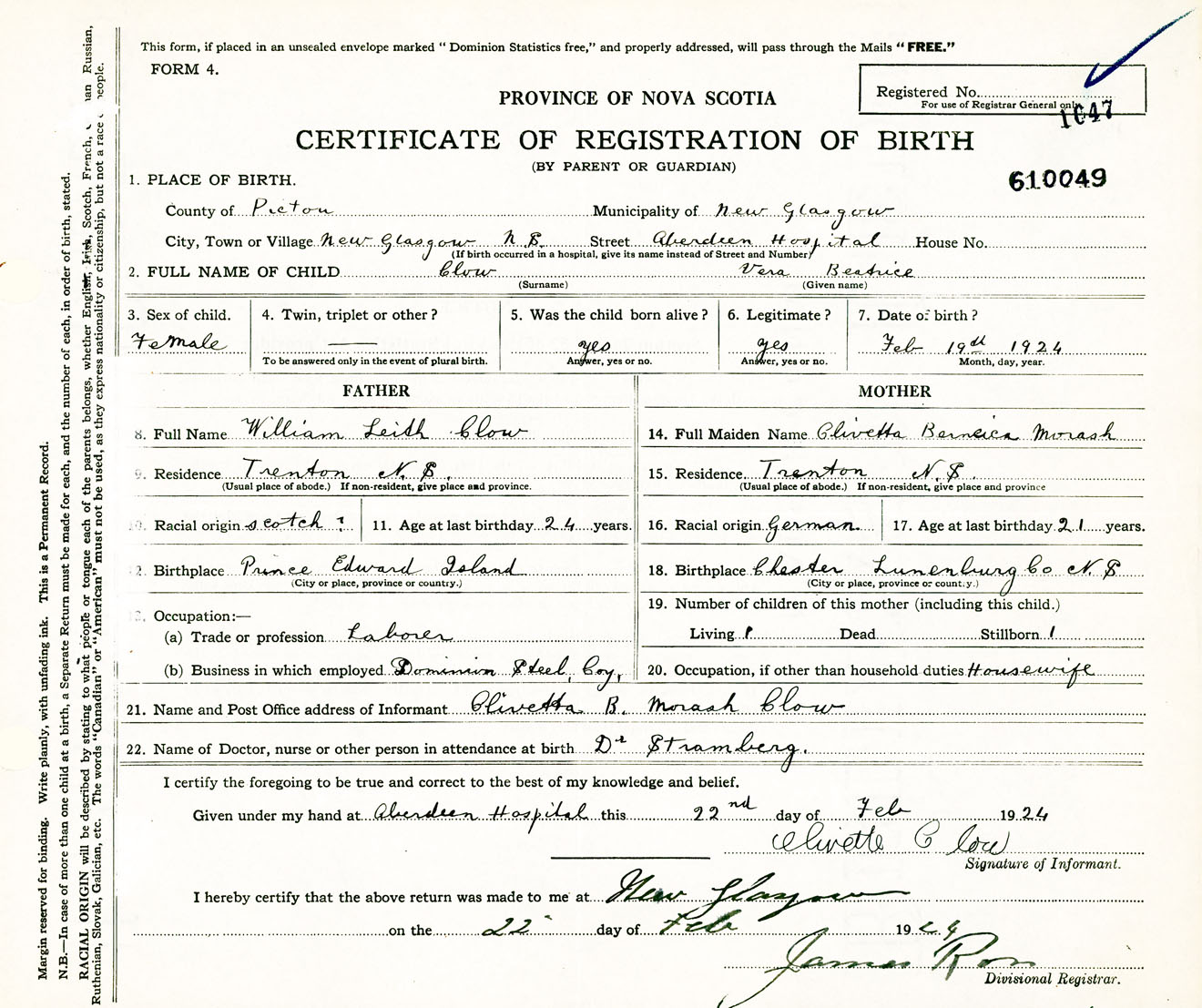 Female Birth Registration: Year: 1924 number: 61000049