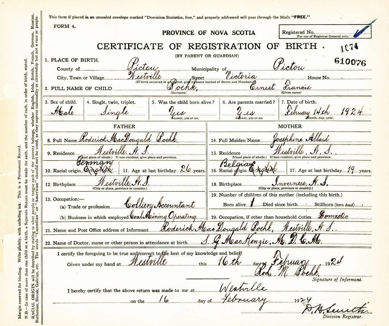 Male Birth Registration: Year: 1924 number: 61000076