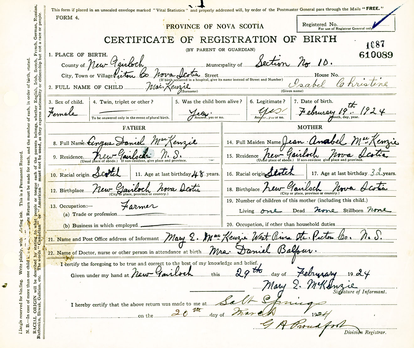 Female Birth Registration: Year: 1924 number: 61000089