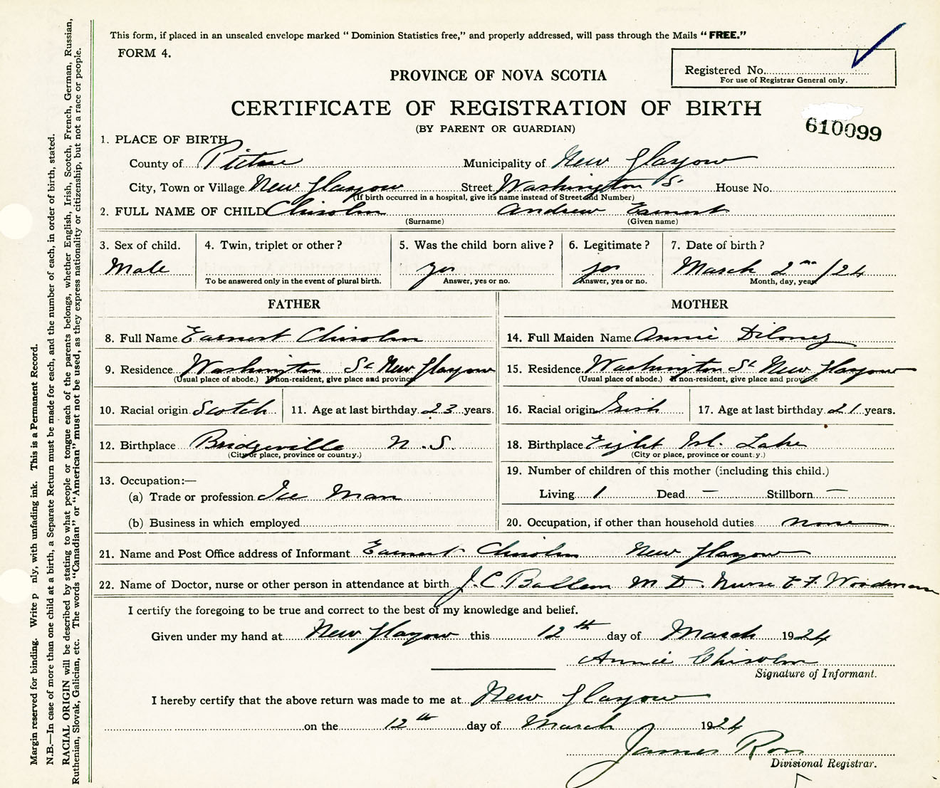 Male Birth Registration: Year: 1924 number: 61000099