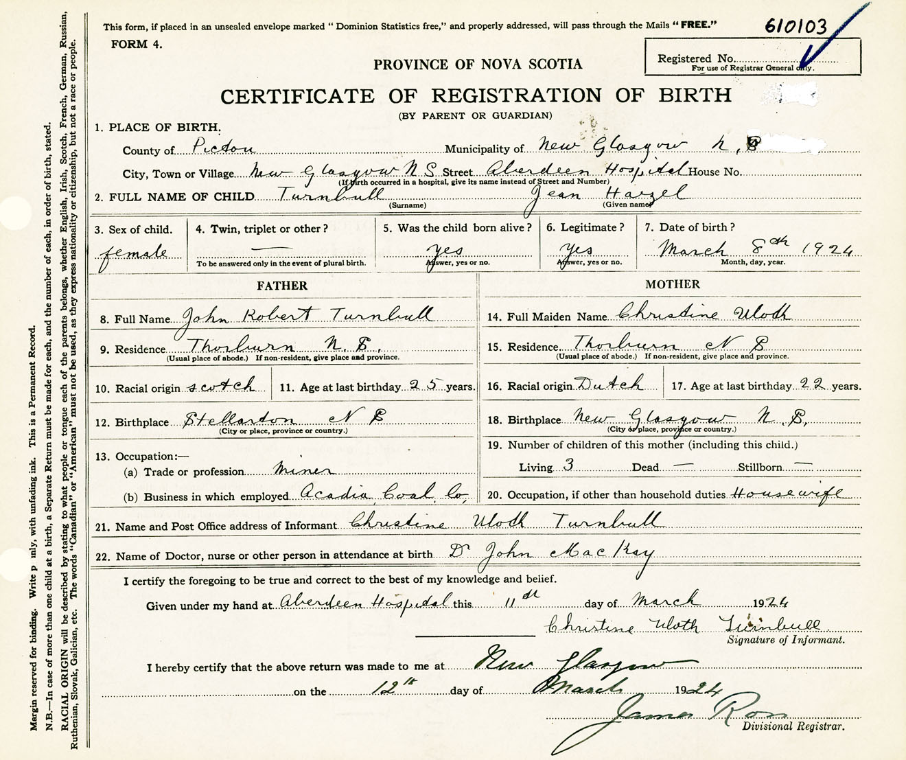 Female Birth Registration: Year: 1924 number: 61000103
