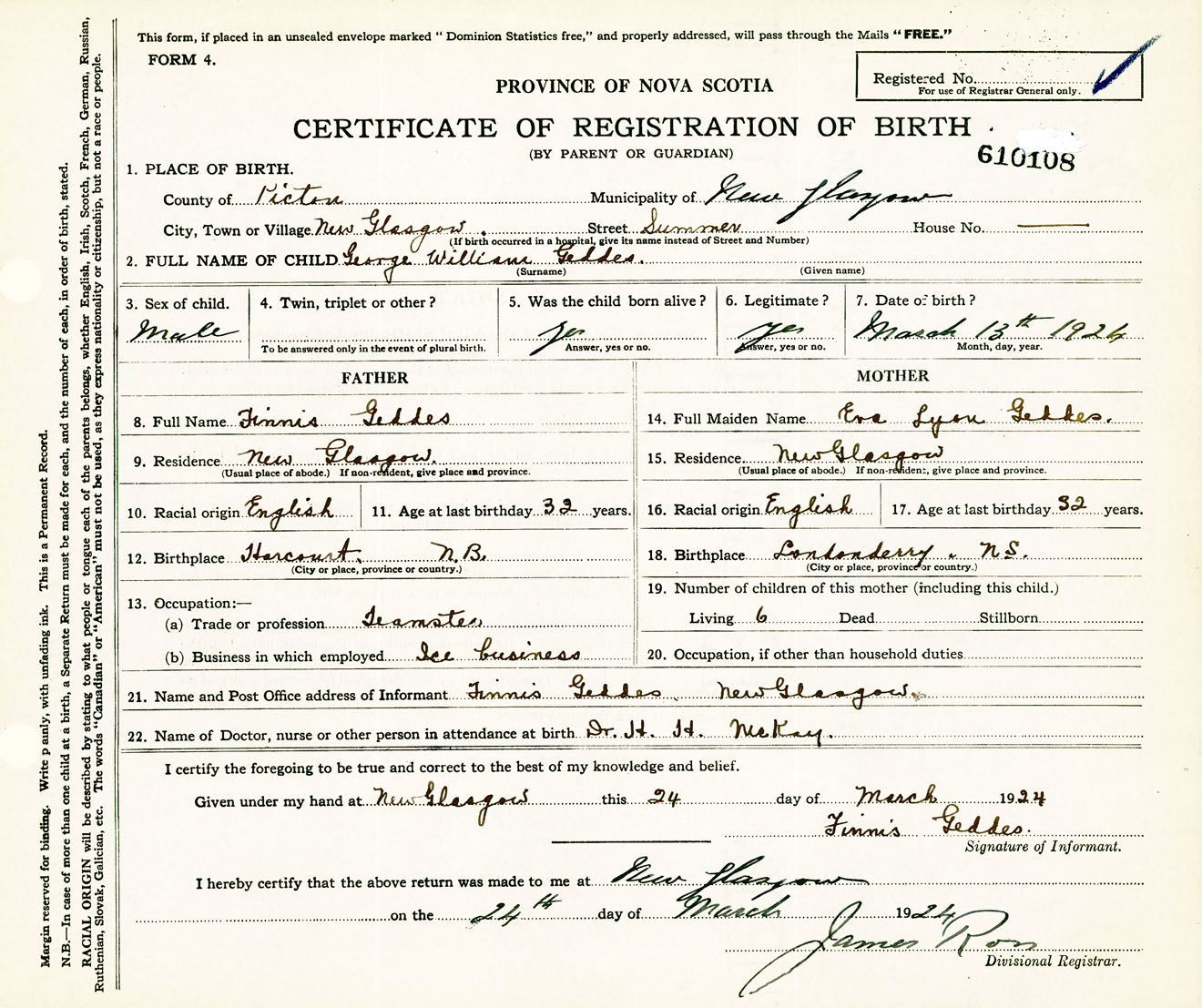 Male Birth Registration: Year: 1924 number: 61000108