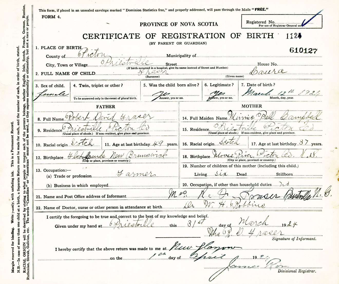 Female Birth Registration: Year: 1924 number: 61000127