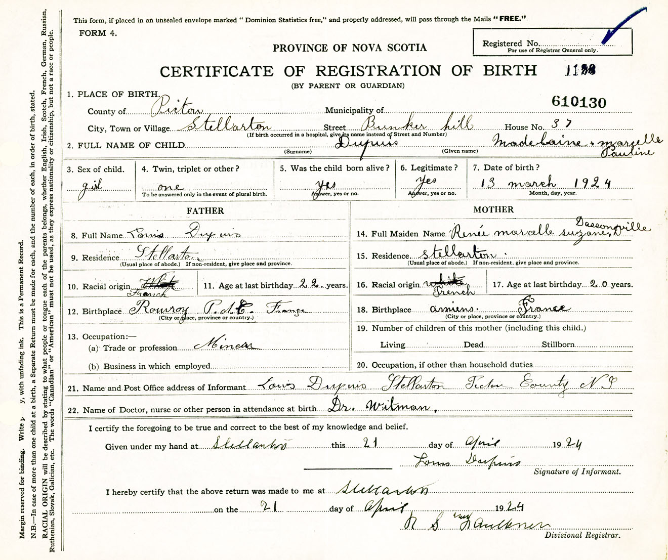 Female Birth Registration: Year: 1924 number: 61000130