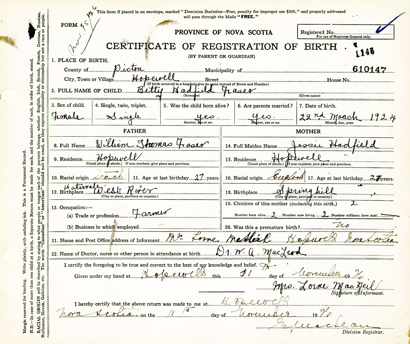 Female Birth Registration: Year: 1924 number: 61000147
