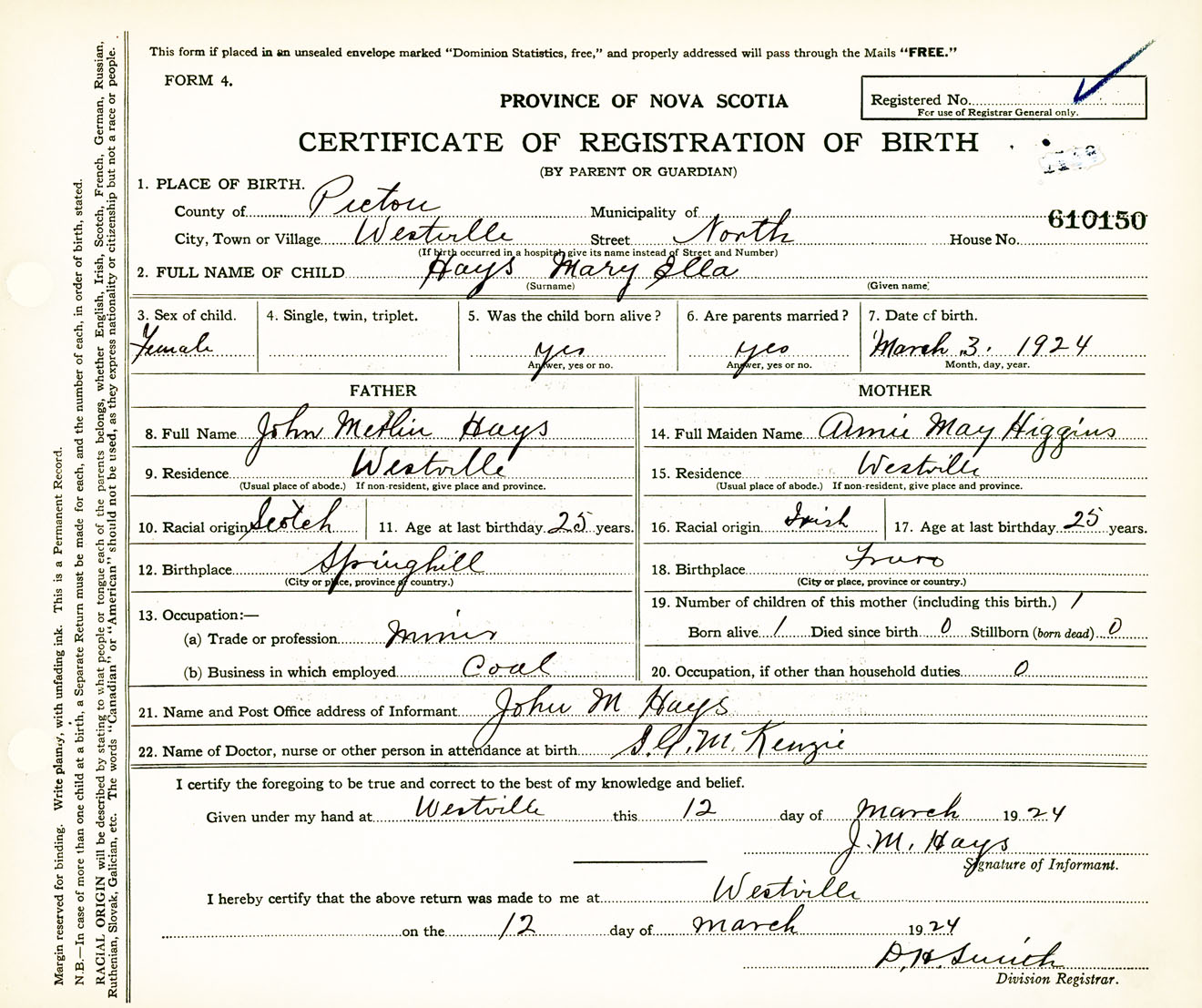 Female Birth Registration: Year: 1924 number: 61000150