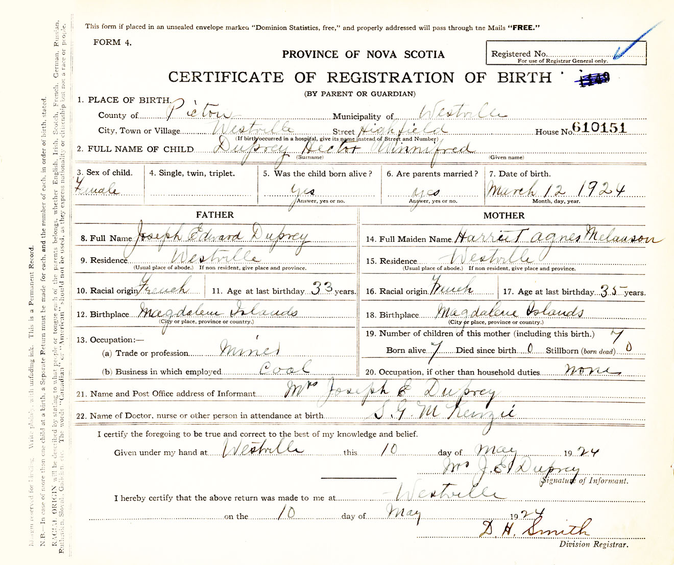 Male Birth Registration: Year: 1924 number: 61000151