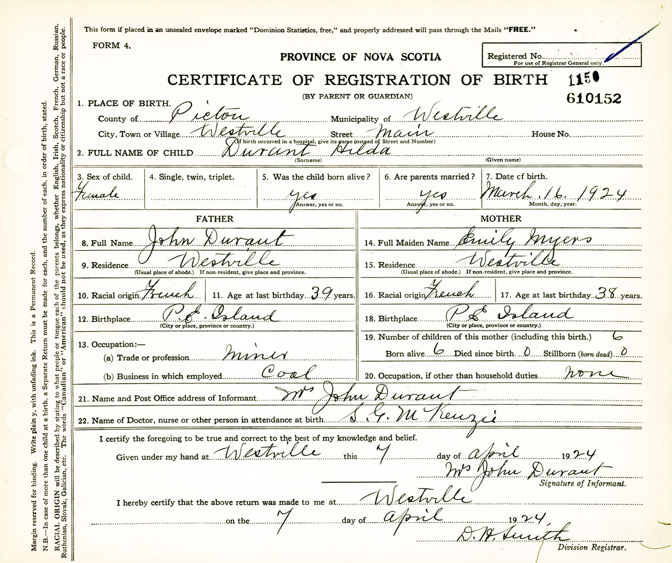 Female Birth Registration: Year: 1924 number: 61000152