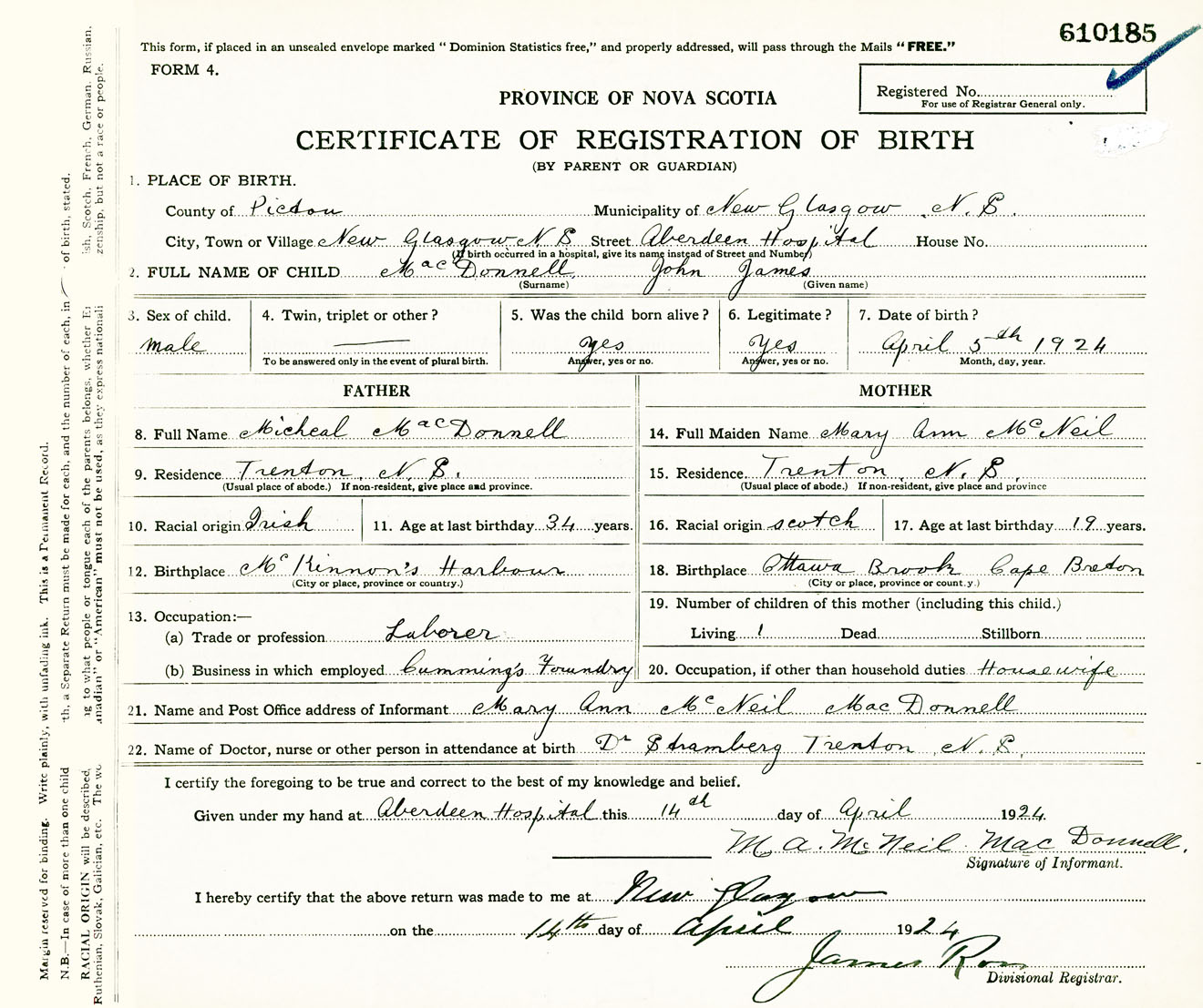 Male Birth Registration: Year: 1924 number: 61000185