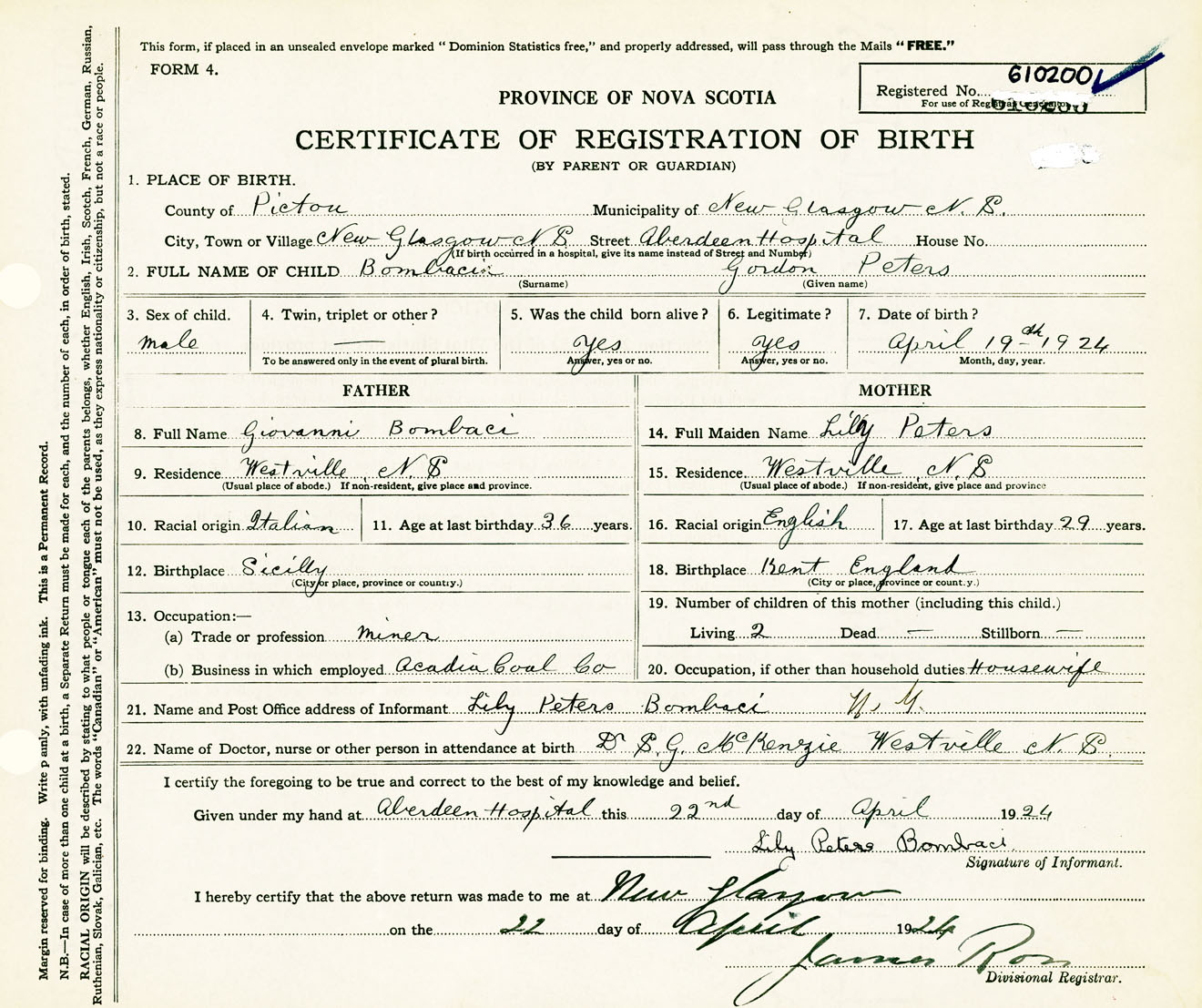 Male Birth Registration: Year: 1924 number: 61000200