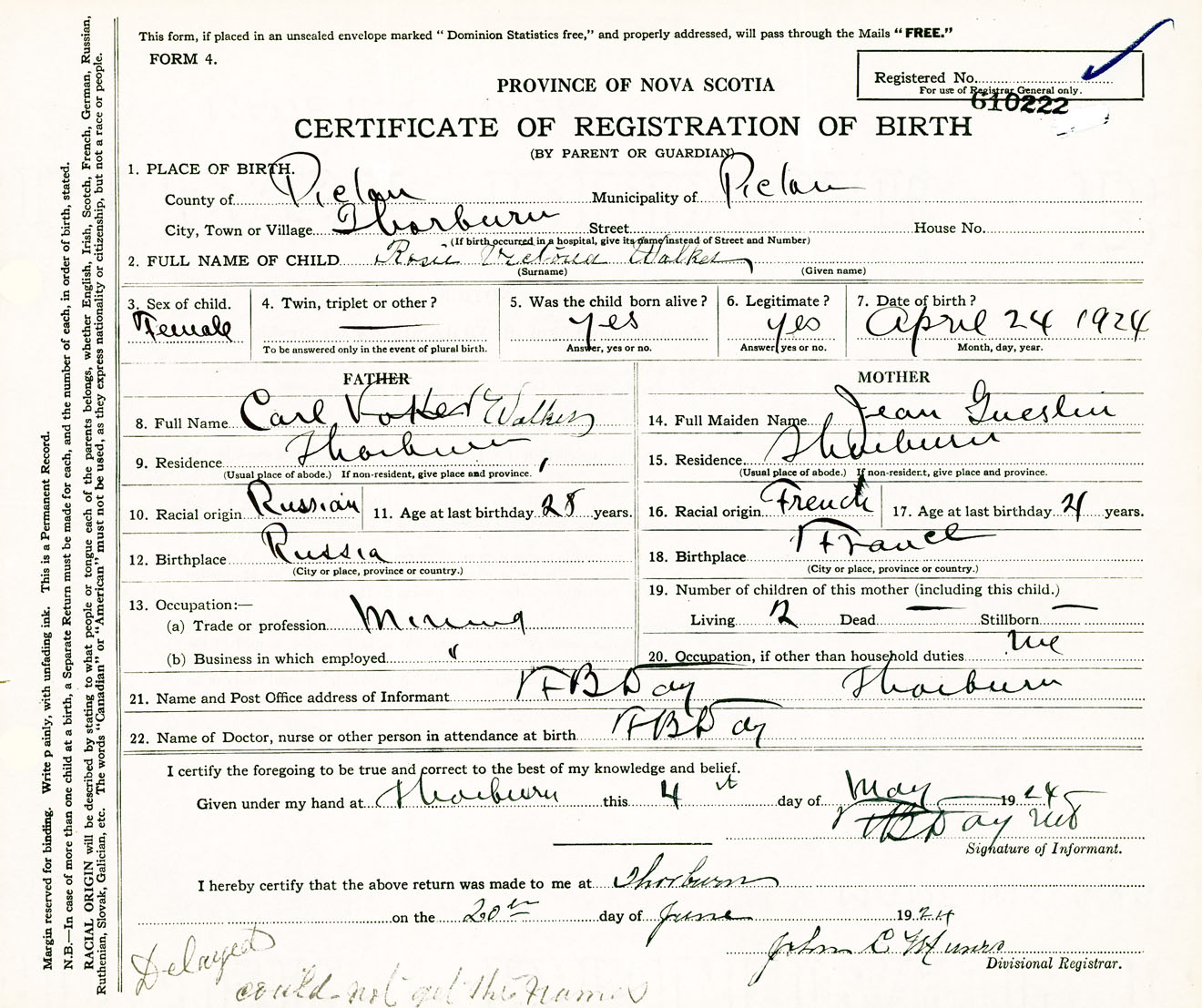 Female Birth Registration: Year: 1924 number: 61000222