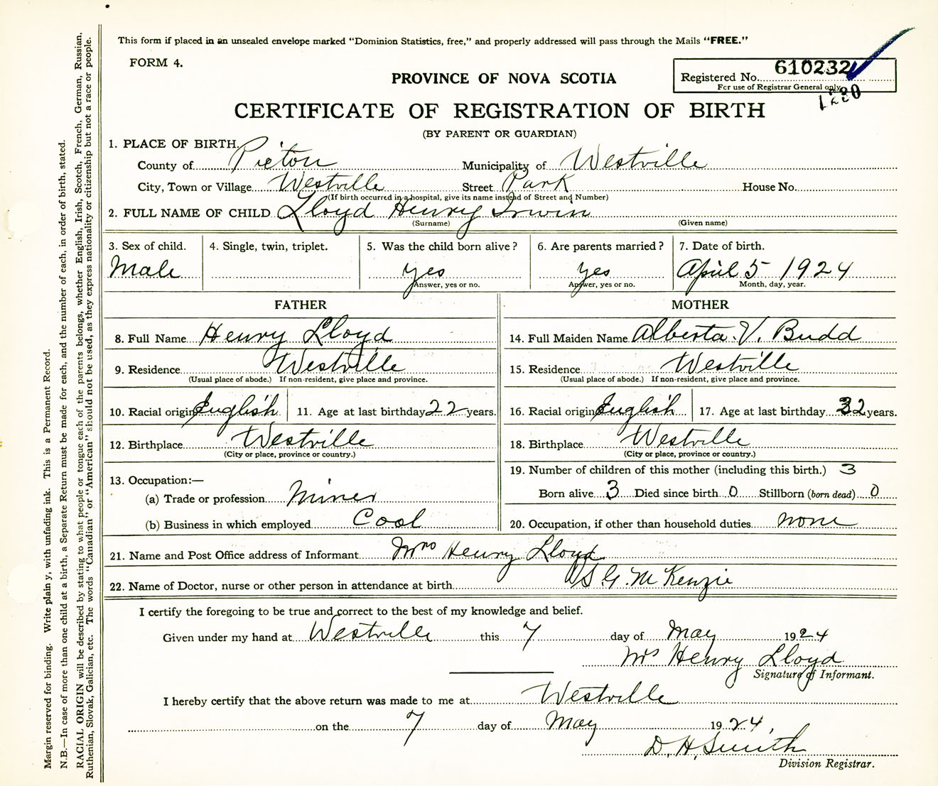 Male Birth Registration: Year: 1924 number: 61000232