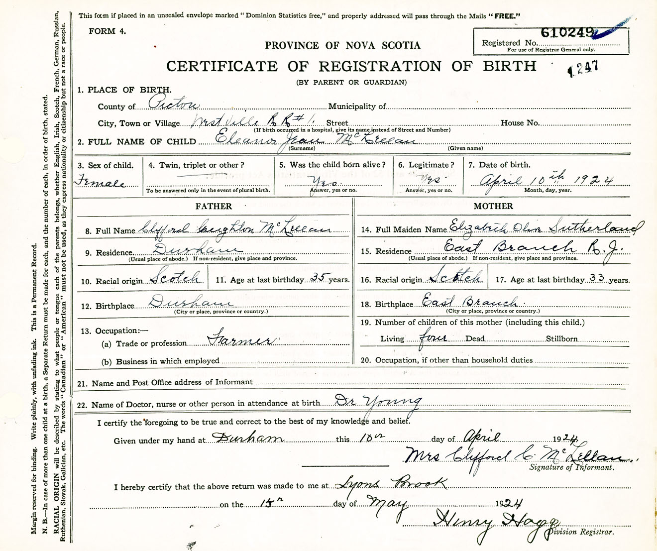Female Birth Registration: Year: 1924 number: 61000249