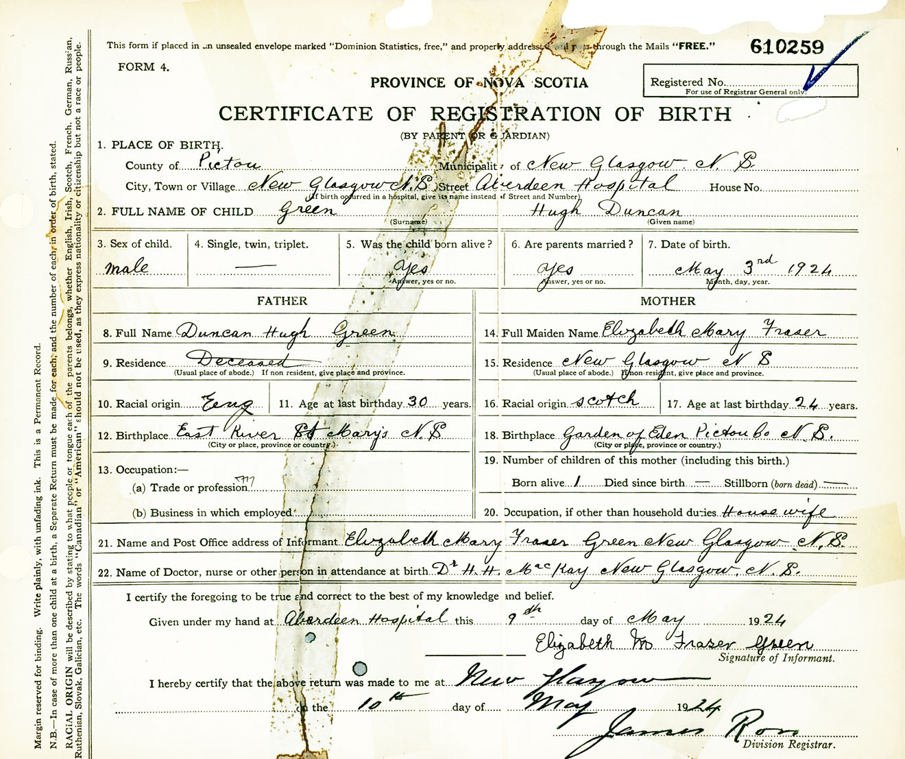 Male Birth Registration: Year: 1924 number: 61000259