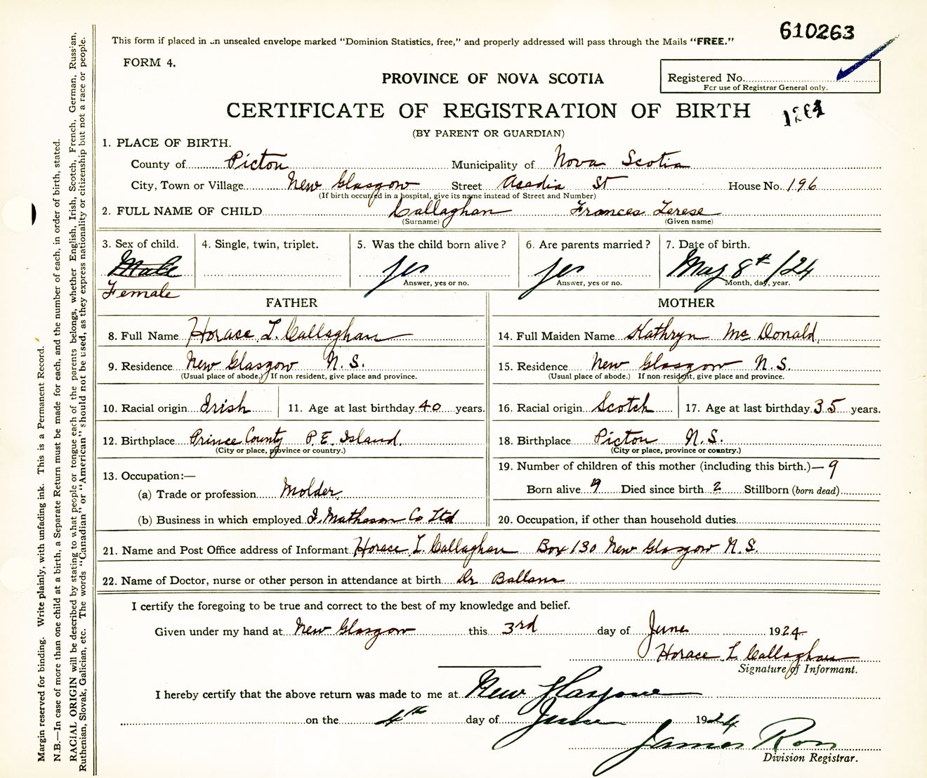 Female Birth Registration: Year: 1924 number: 61000263