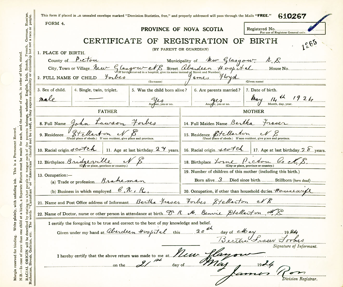 Male Birth Registration: Year: 1924 number: 61000267