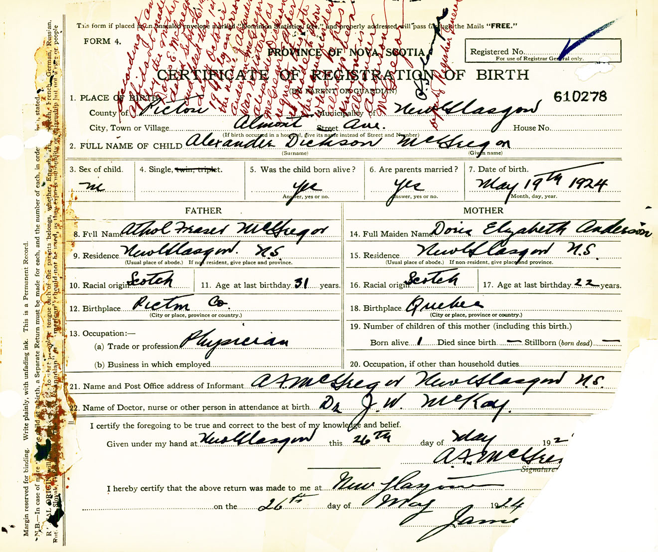 Male Birth Registration: Year: 1924 number: 61000278