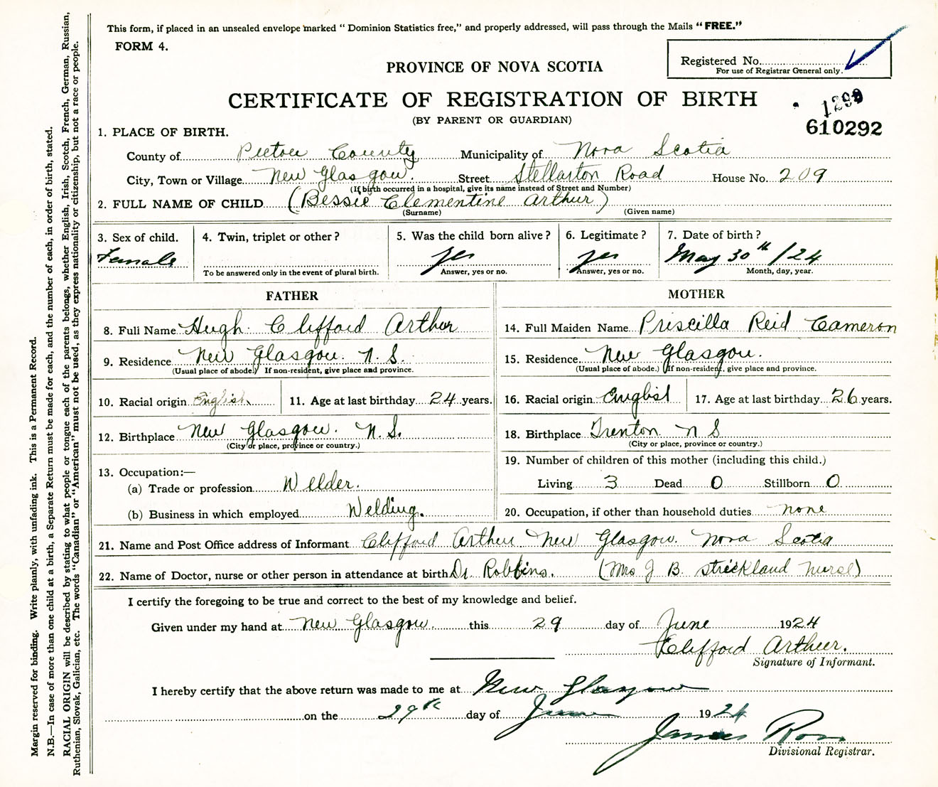 Female Birth Registration: Year: 1924 number: 61000292