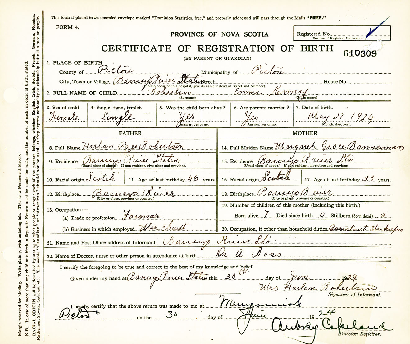 Female Birth Registration: Year: 1924 number: 61000309