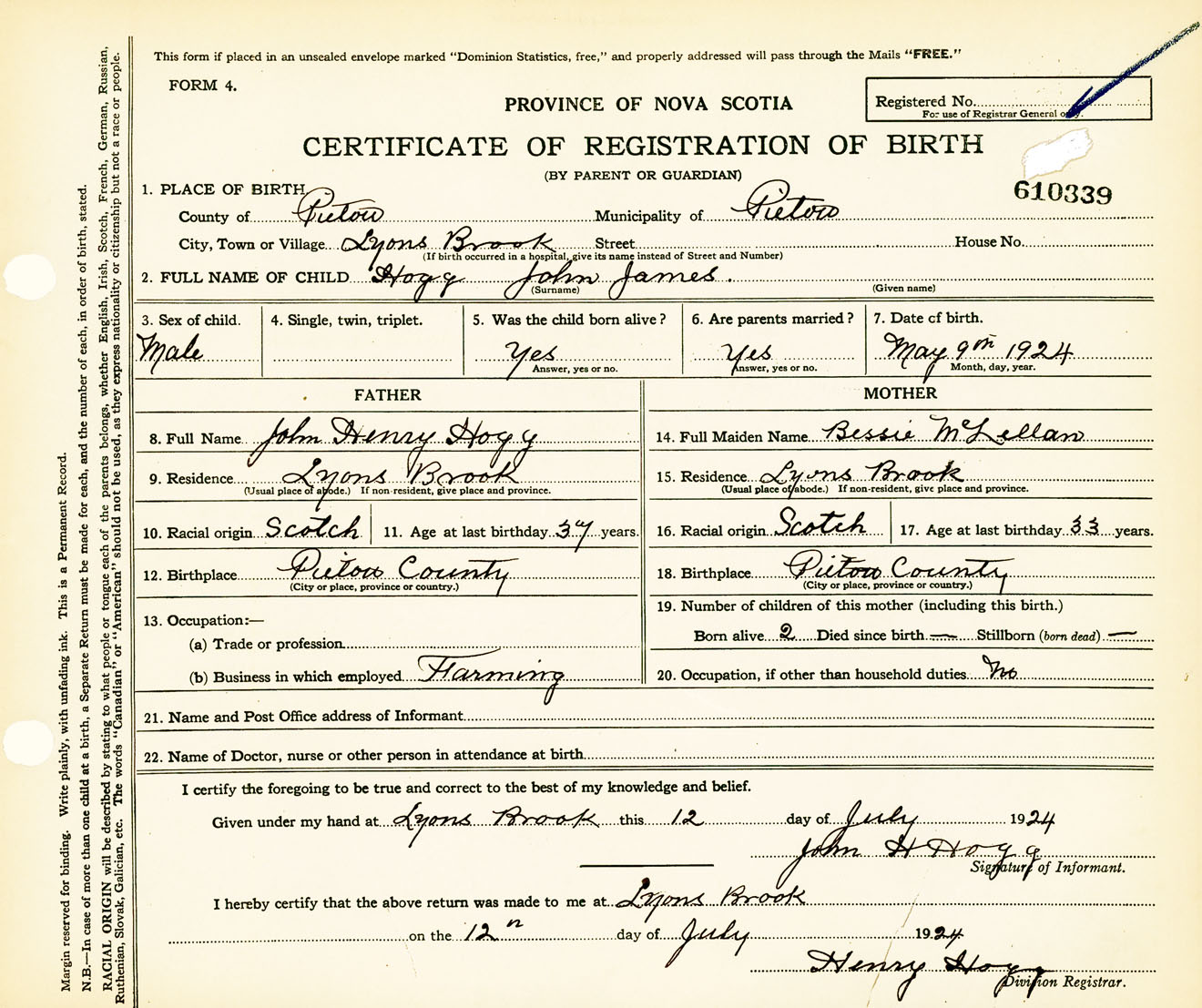 Male Birth Registration: Year: 1924 number: 61000339