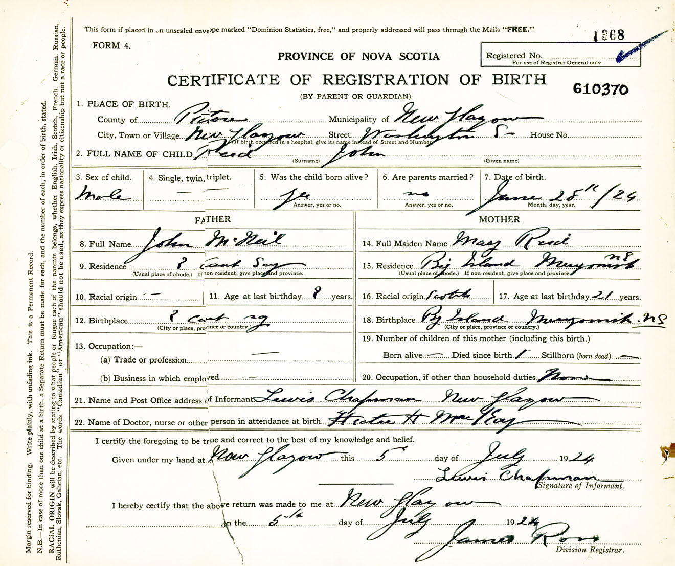 Male Birth Registration: Year: 1924 number: 61000370