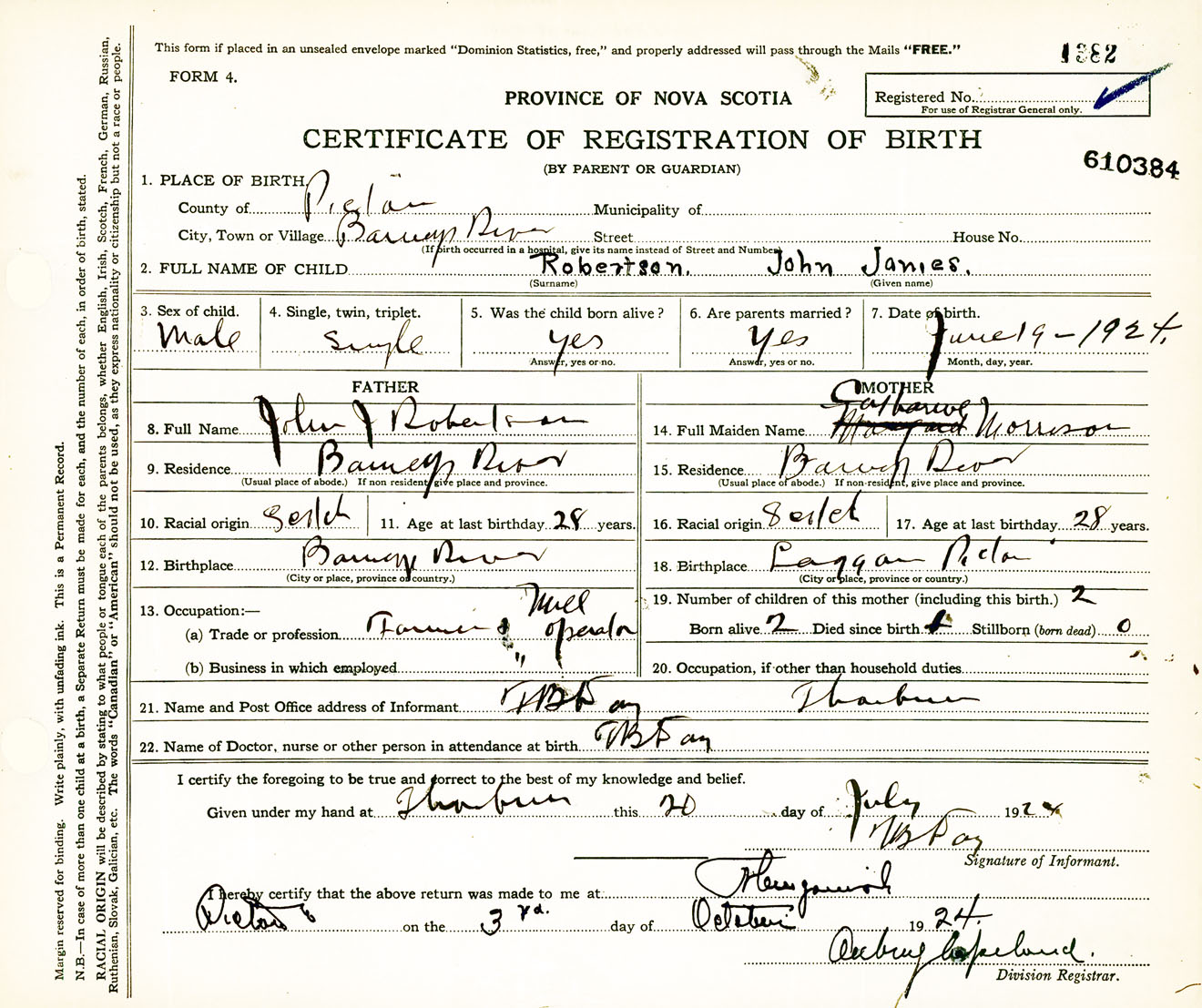 Male Birth Registration: Year: 1924 number: 61000384