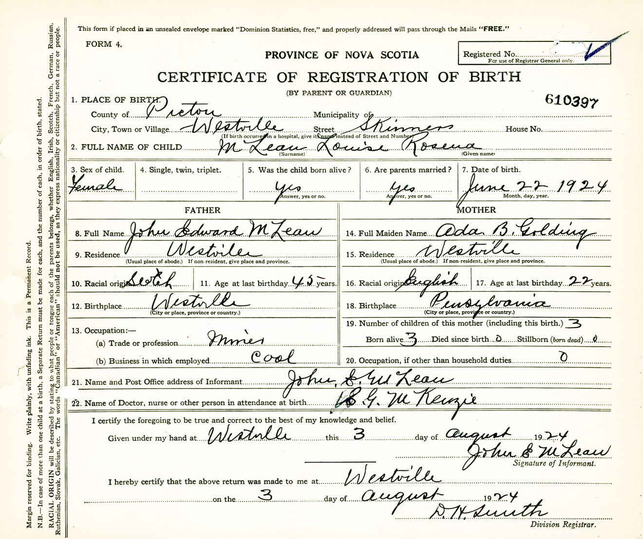 Female Birth Registration: Year: 1924 number: 61000397