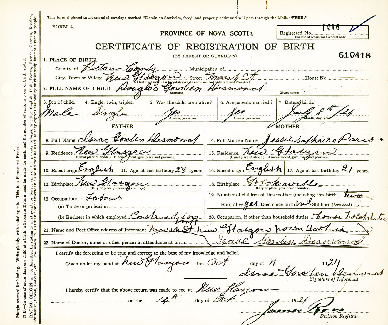 Male Birth Registration: Year: 1924 number: 61000418