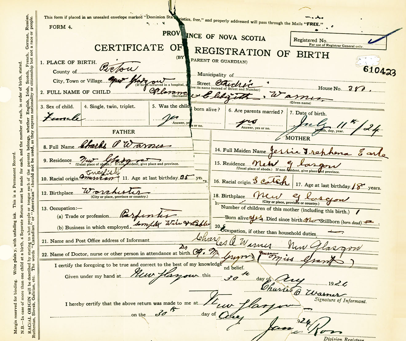 Female Birth Registration: Year: 1924 number: 61000423