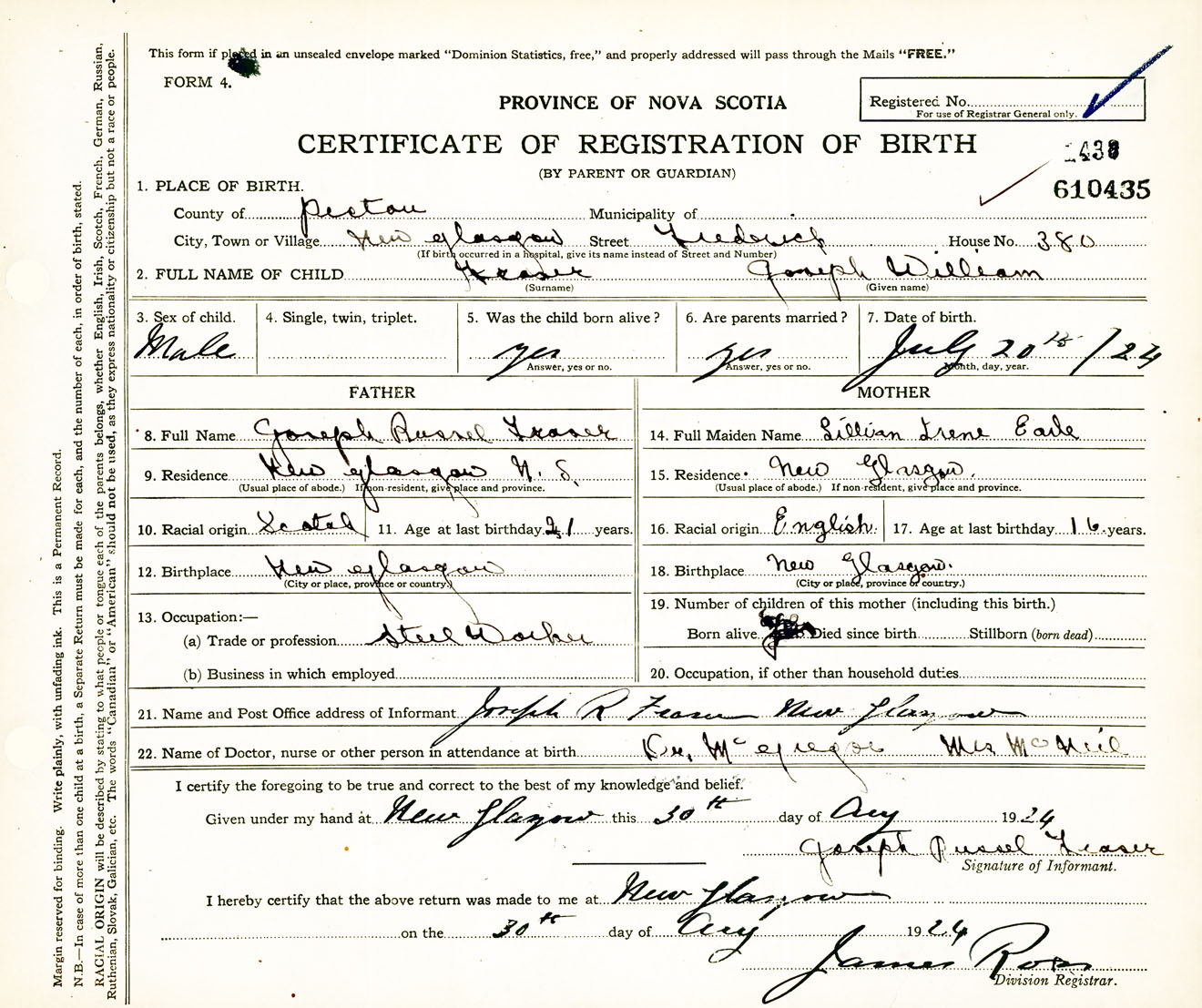 Male Birth Registration: Year: 1924 number: 61000435