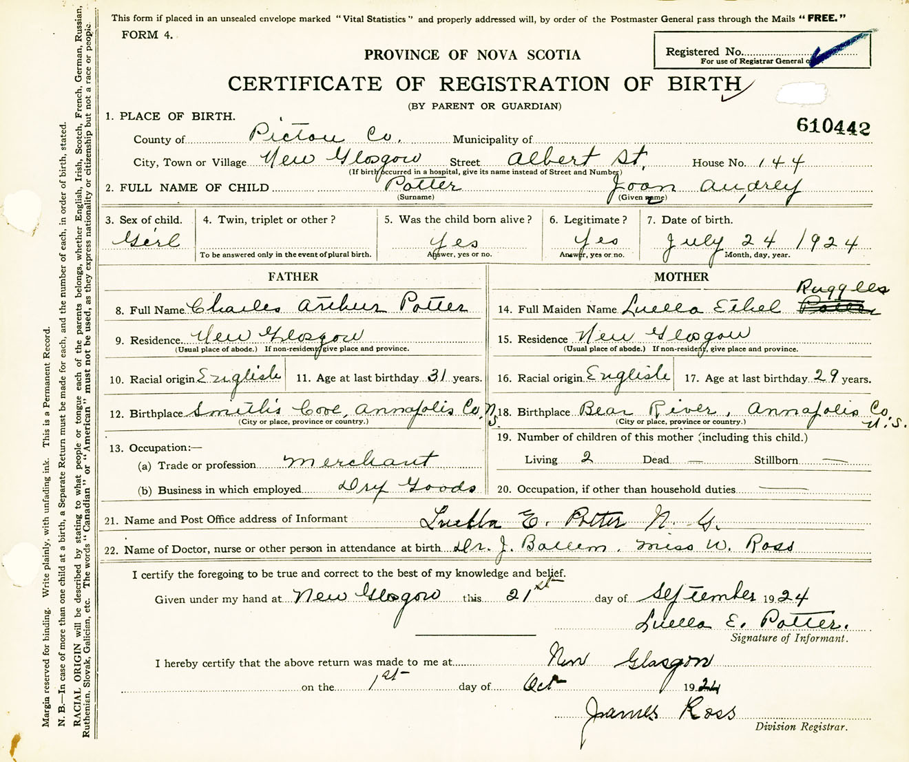 Female Birth Registration: Year: 1924 number: 61000442