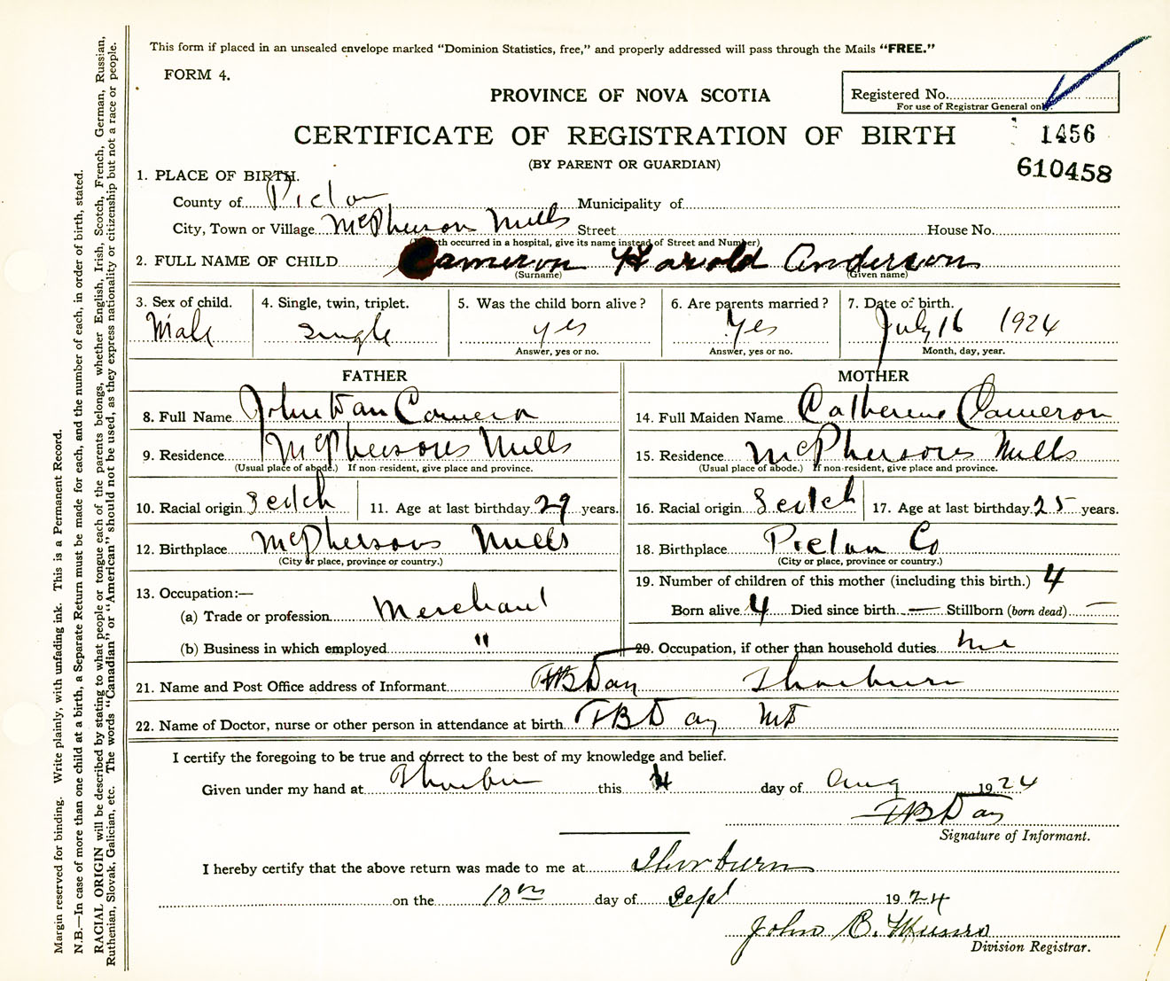 Male Birth Registration: Year: 1924 number: 61000458