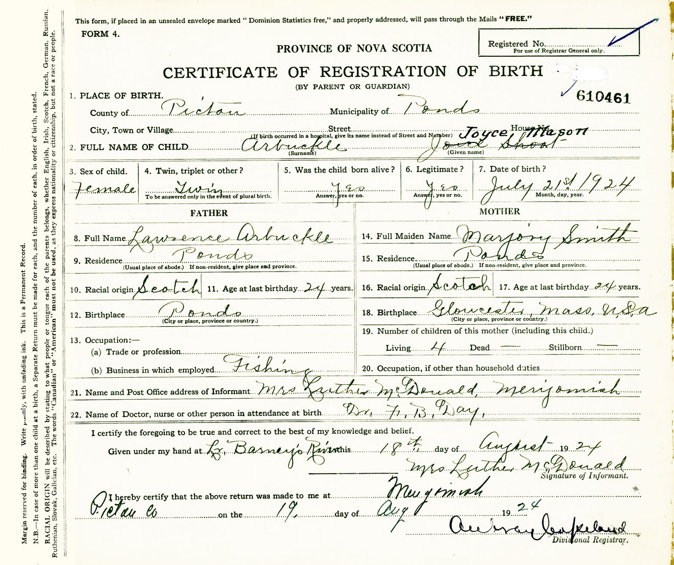 Female Birth Registration: Year: 1924 number: 61000461