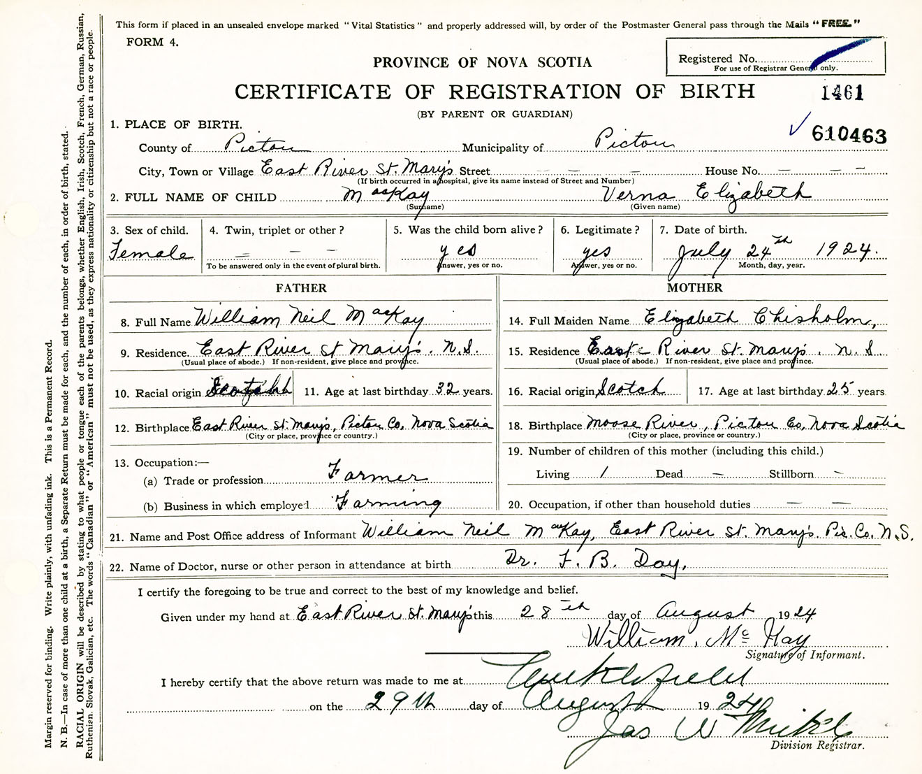 Female Birth Registration: Year: 1924 number: 61000463