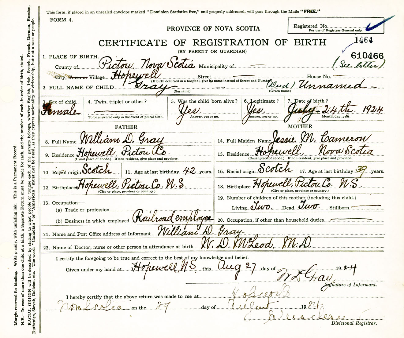 Female Birth Registration: Year: 1924 number: 61000466