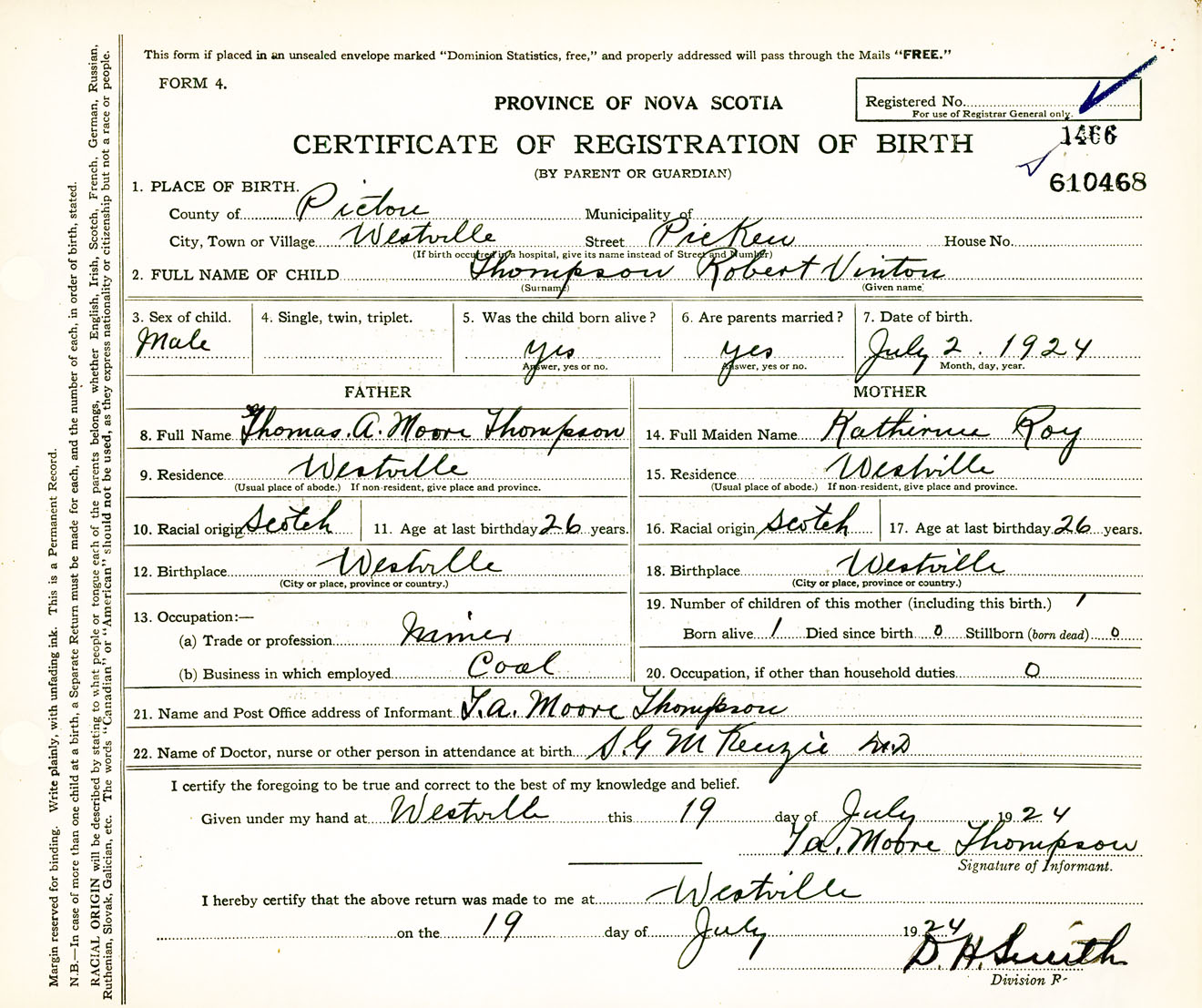 Male Birth Registration: Year: 1924 number: 61000468