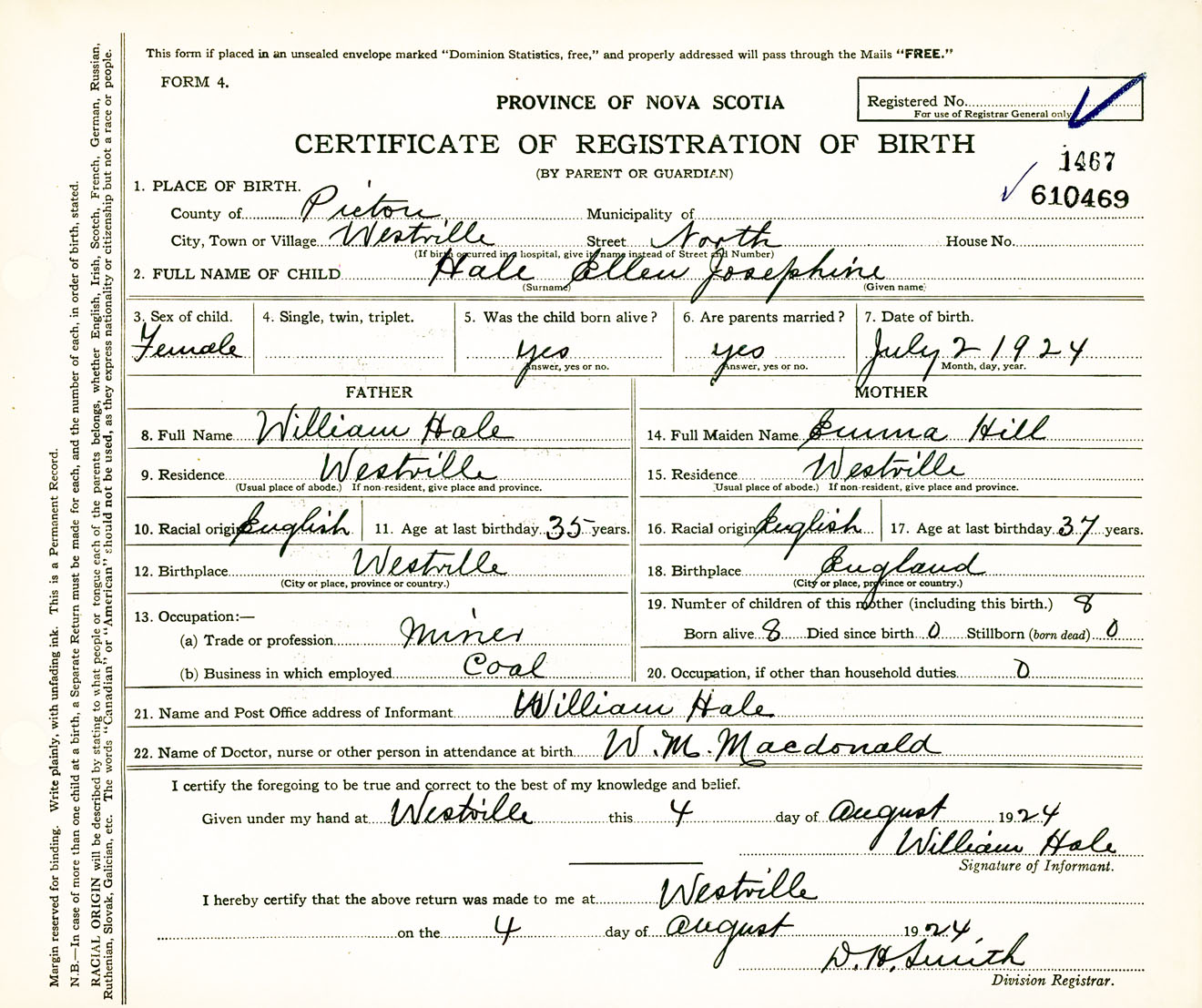 Female Birth Registration: Year: 1924 number: 61000469