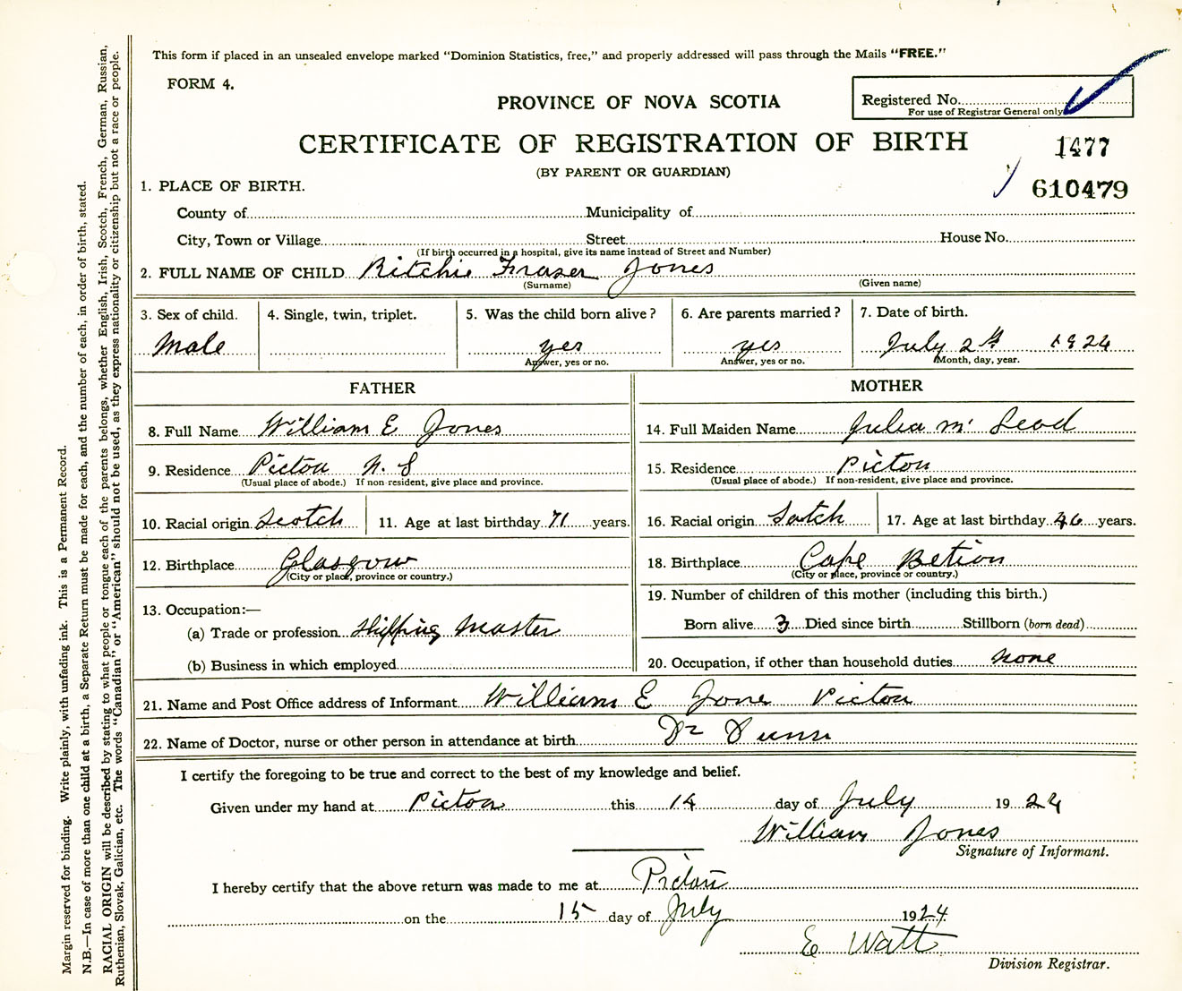 Male Birth Registration: Year: 1924 number: 61000479