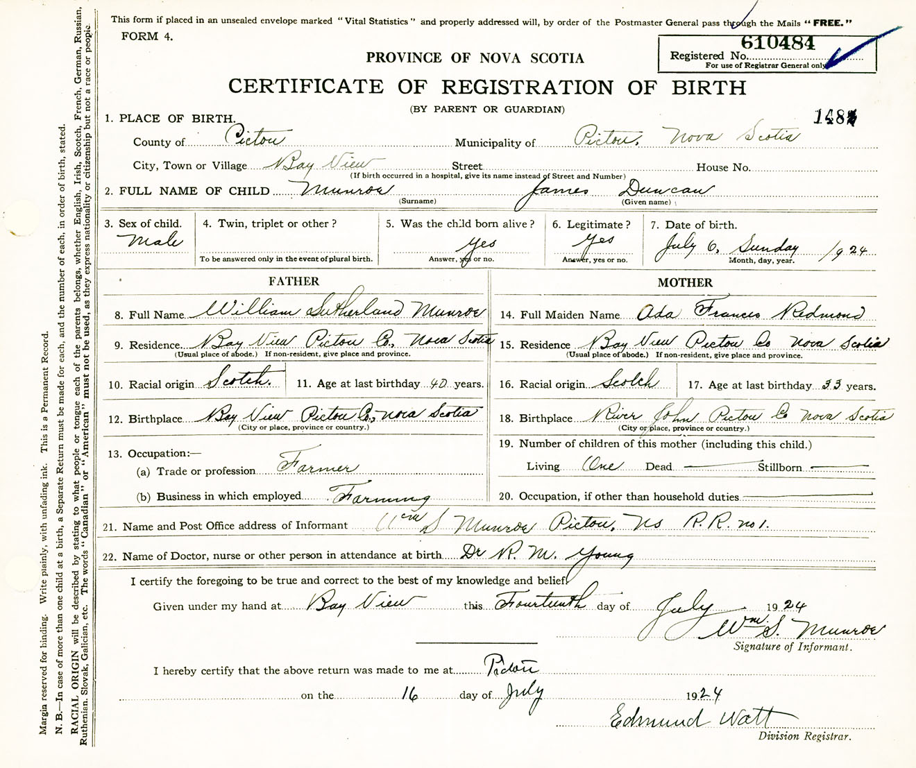Male Birth Registration: Year: 1924 number: 61000484