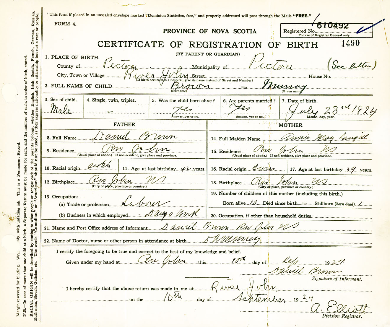 Male Birth Registration: Year: 1924 number: 61000492