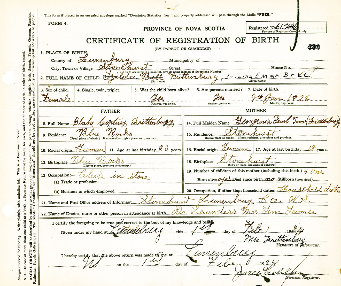 Female Birth Registration: Year: 1924 number: 61500696