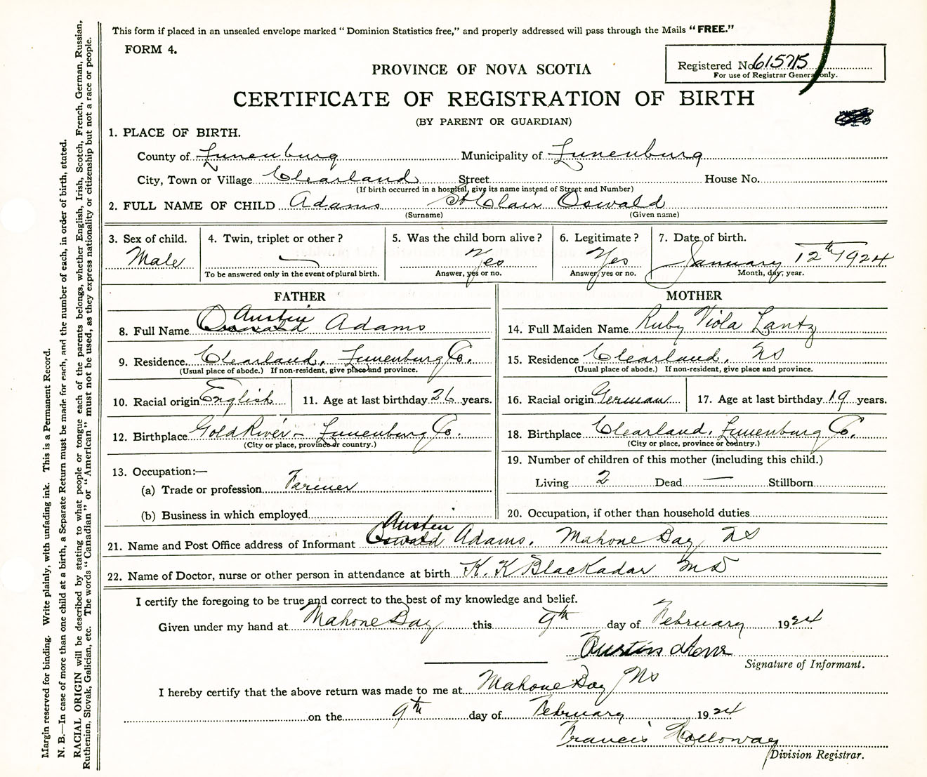 Male Birth Registration: Year: 1924 number: 61500715