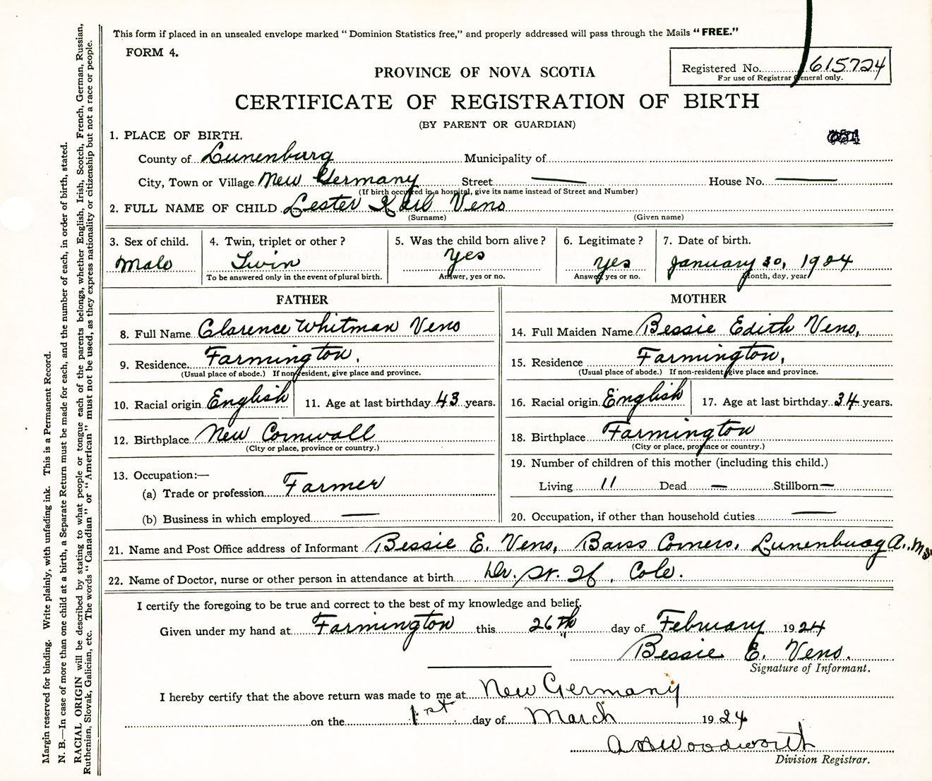 Male Birth Registration: Year: 1924 number: 61500724