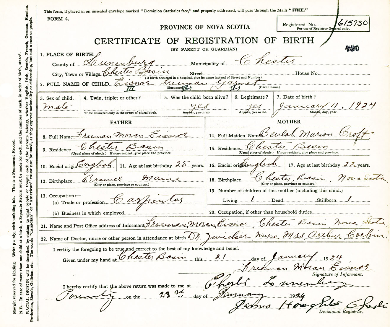 Male Birth Registration: Year: 1924 number: 61500730