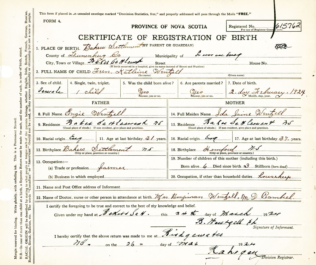 Female Birth Registration: Year: 1924 number: 61500762