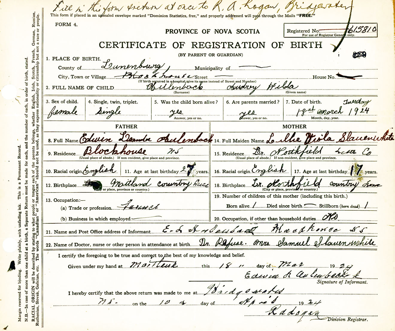 Female Birth Registration: Year: 1924 number: 61500810