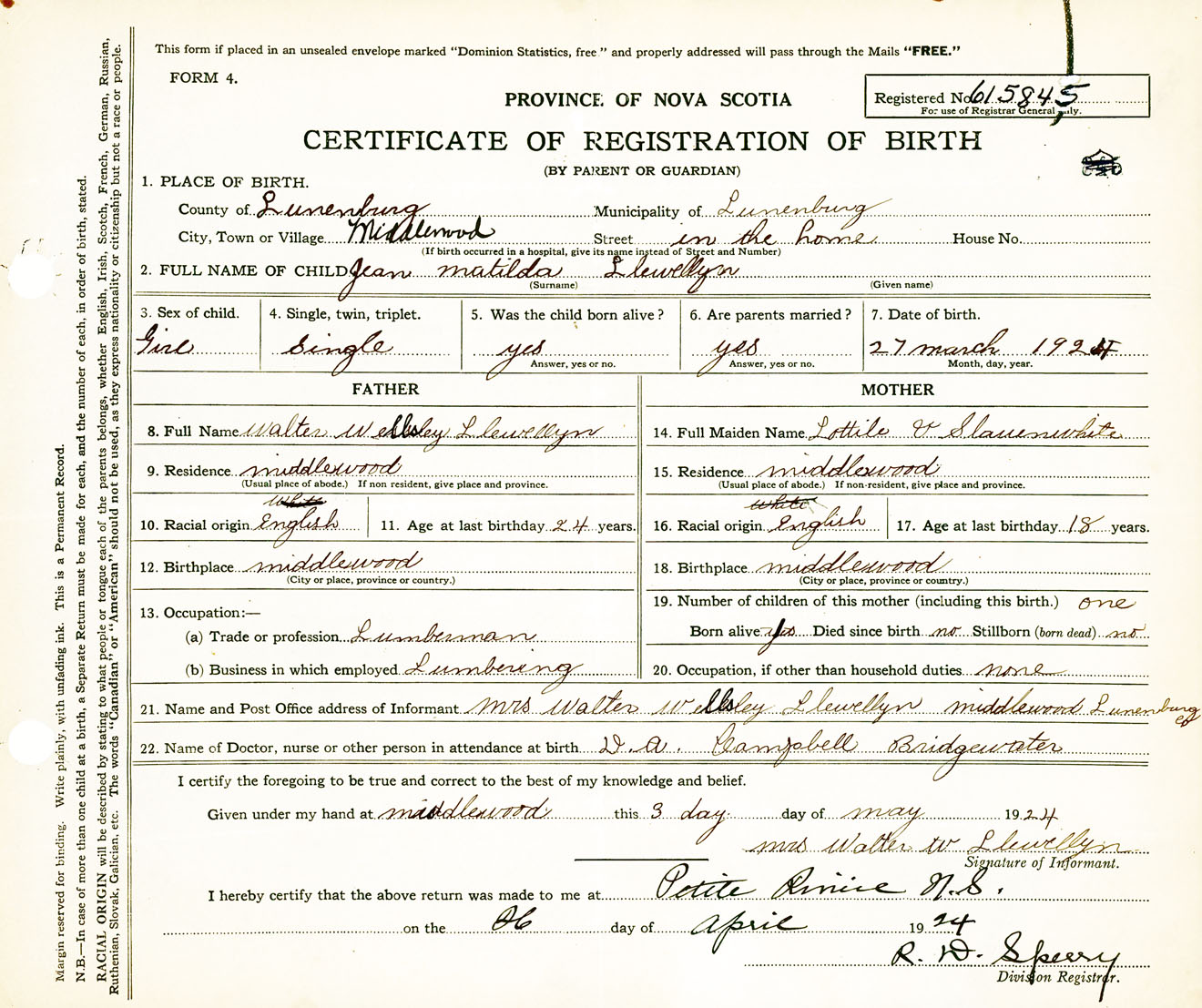 Female Birth Registration: Year: 1924 number: 61500845